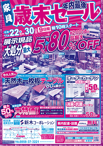 11月22日(土)から30日(日)まで家具歳末セールを開催いたします。